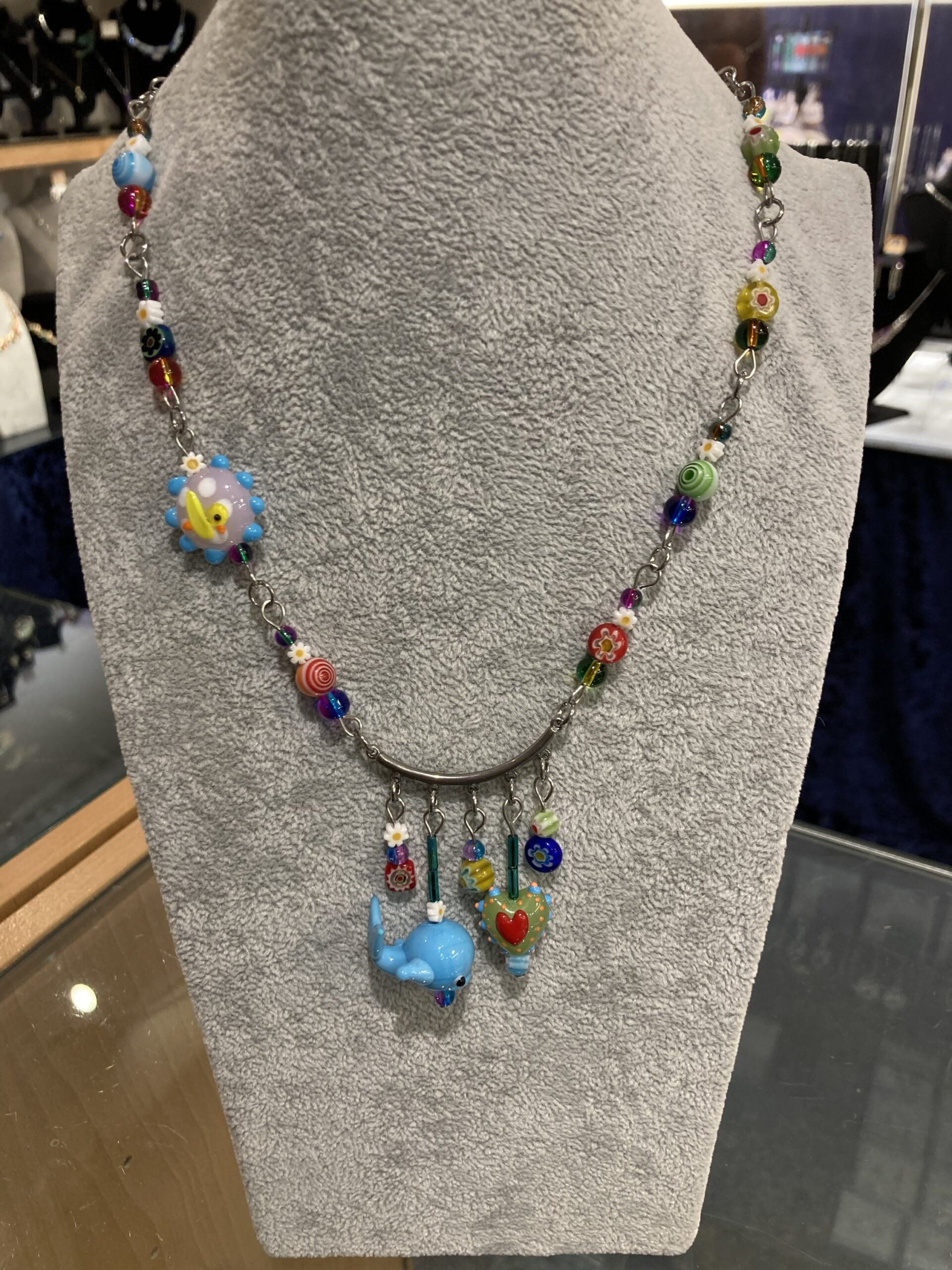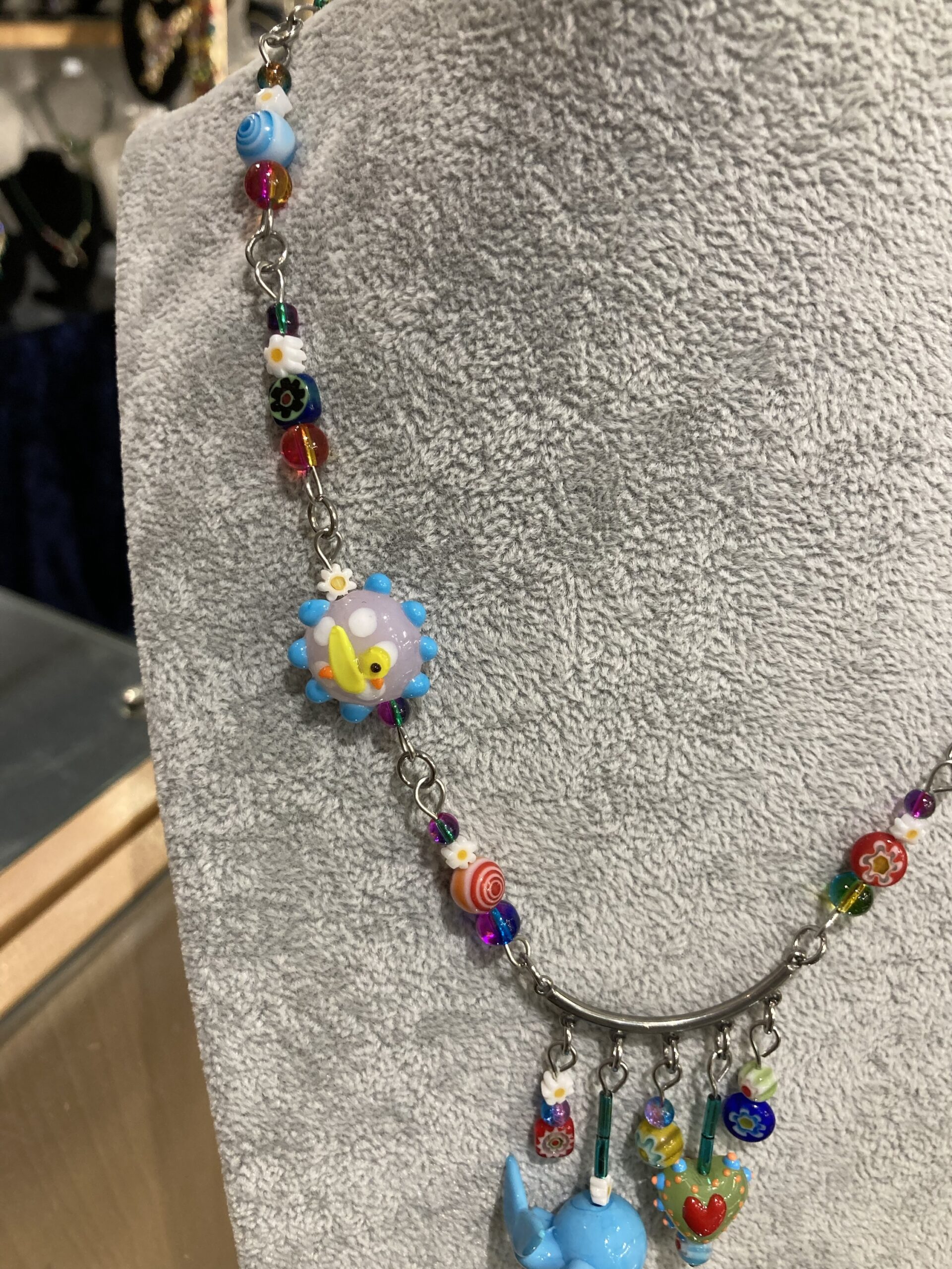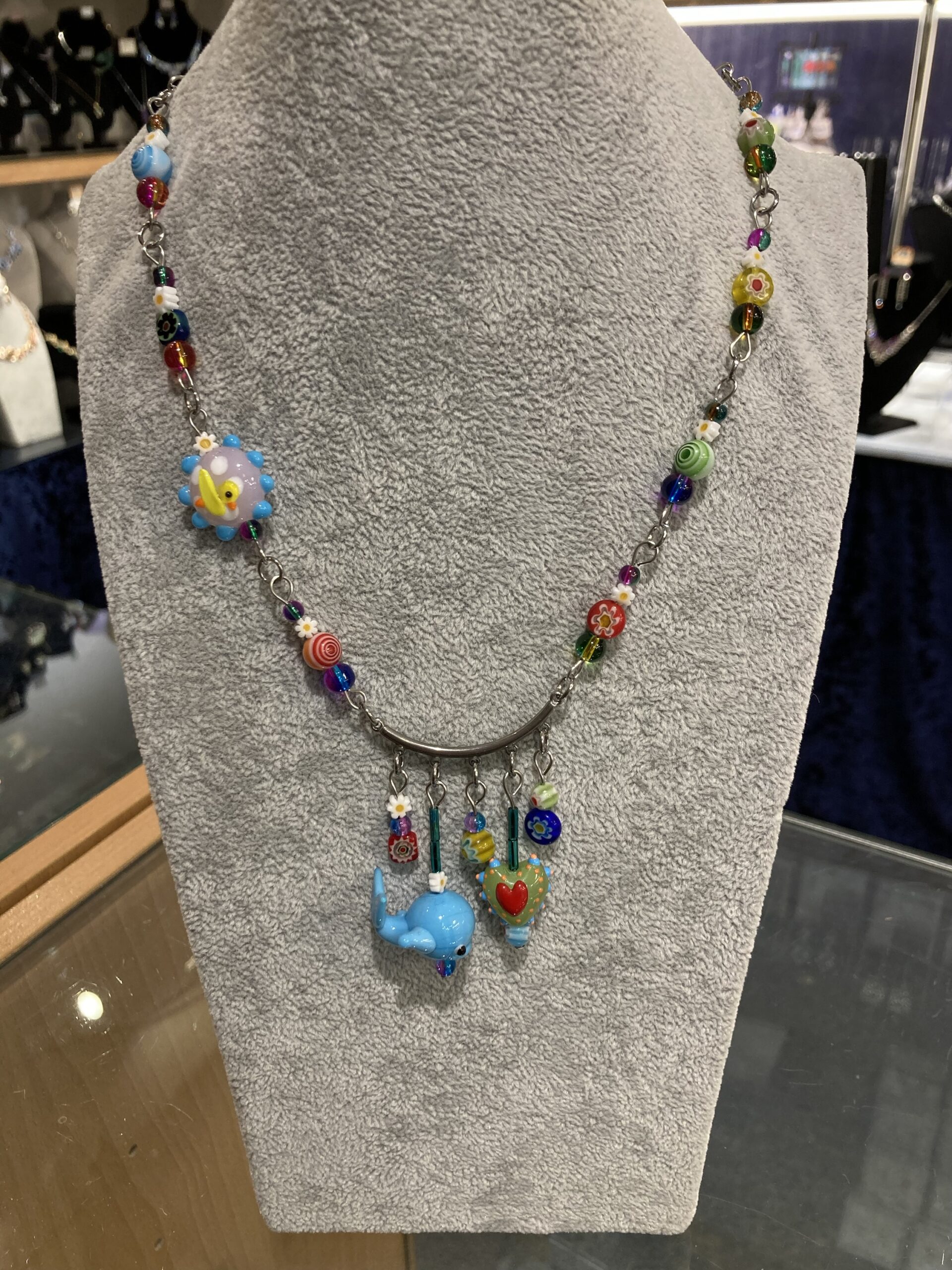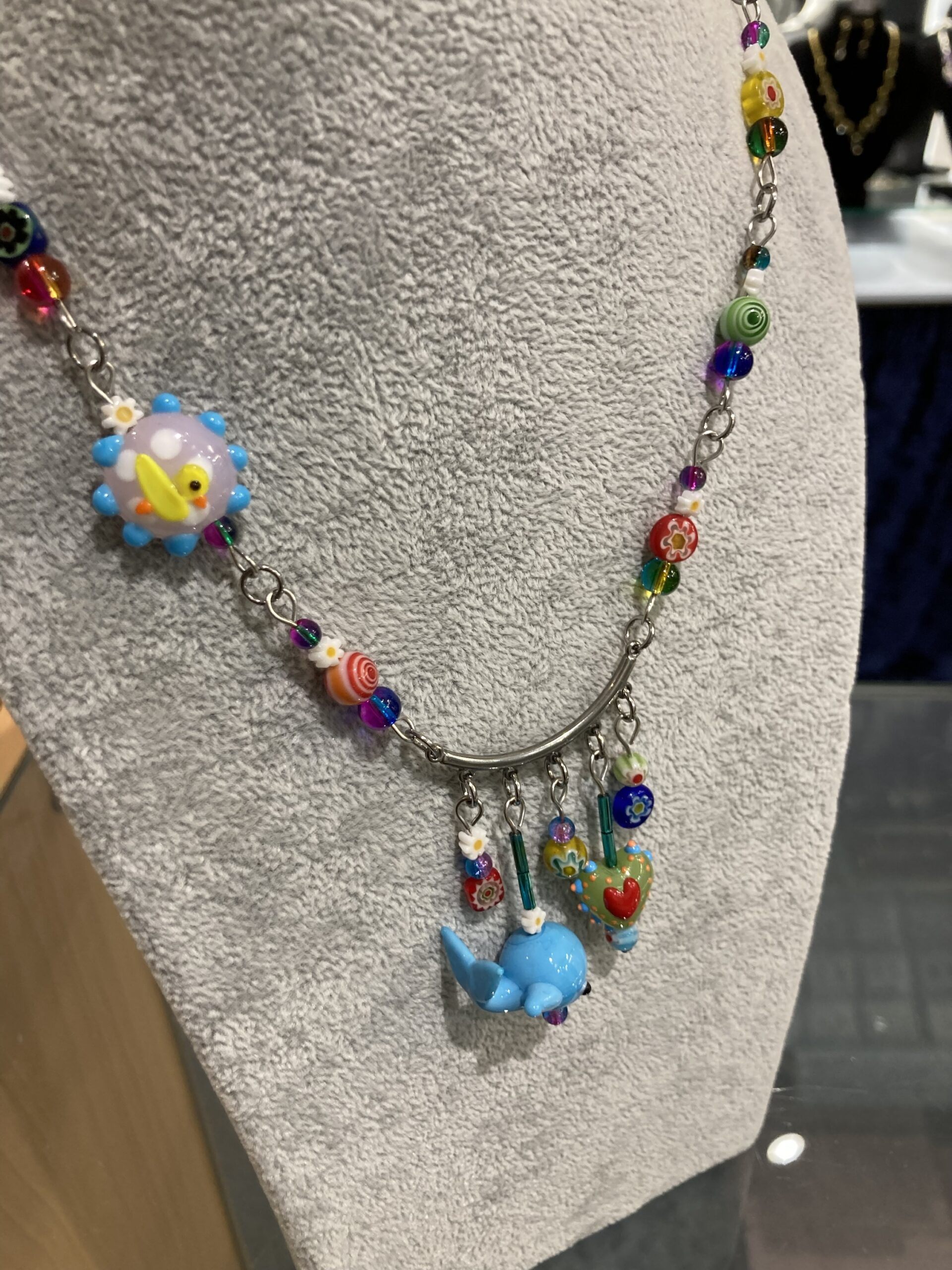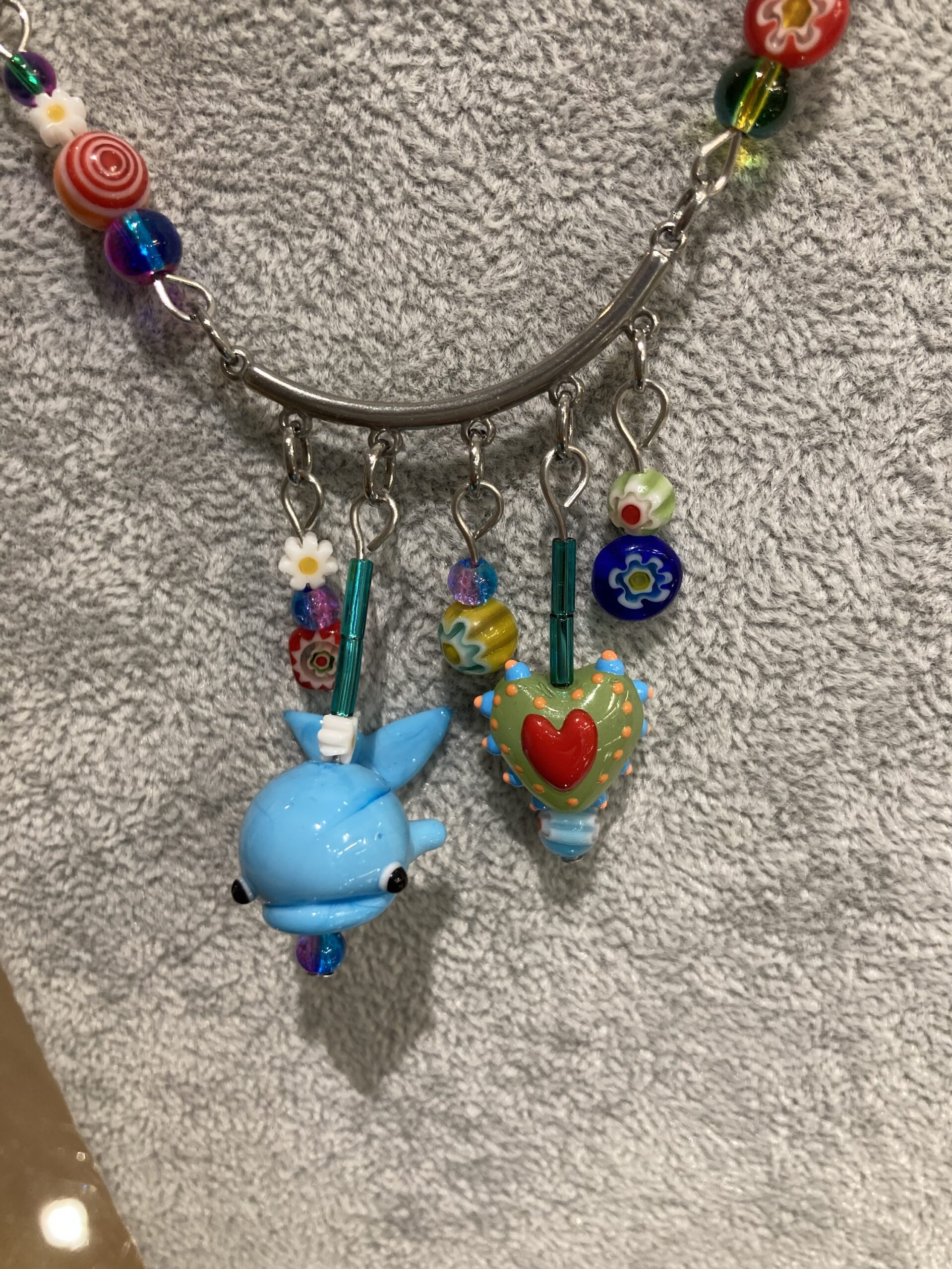 Colourful glass beads with novelty Whale, Heart and duck motive.